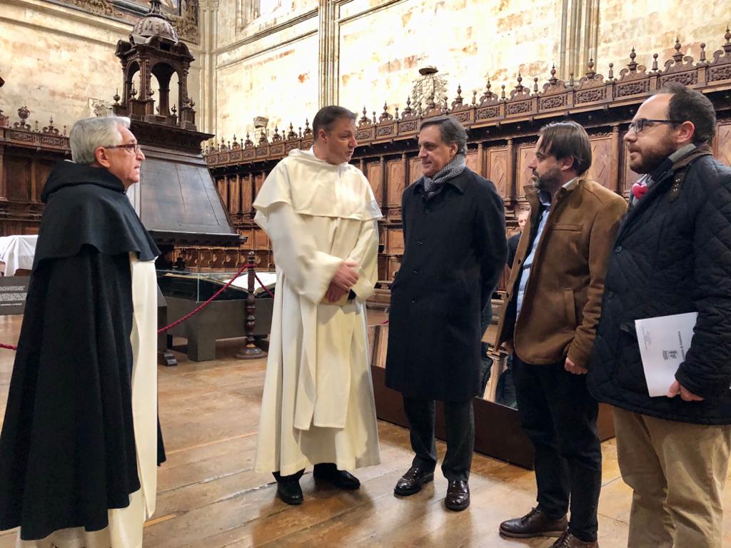 El alcalde de Salamanca, Carlos García Carbayo, acompañado por el que hasta ahora fuera el prior de los Dominicos en la ciudad, Ricardo de Luis Carballada, el concejal de Turismo, Fernando Castaño, y el concejal de Fomento y Patrimonio, Daniel Llanos, ha visitado hoy la nueva musealización del Convento de San Esteban, con la que se completa la intervención en este espacio patrimonial, después de la inauguración del mirador en la pasada primavera.