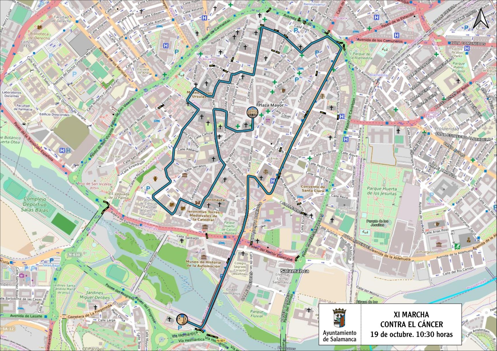 La Marcha partirá desde la Iglesia Nueva del Arrabal y se verán afectadas la glorieta Virgen de Loreto, puente Enrique Estevan, calle Santa Brígida, avenida Reyes de España, paseo del Rector Esperabé, calle San Pablo, calle Juan de la Fuente, Gran Vía, calles Escoto y Marquesa de Almarza, plaza de España, avenida de María Auxiliadora, avenida de Mirat, calles Santa Teresa y Peña Primera, Cuesta del Carmen, Cuesta de San Blas, Vaguada de la Palma y paseo de San Gregorio.