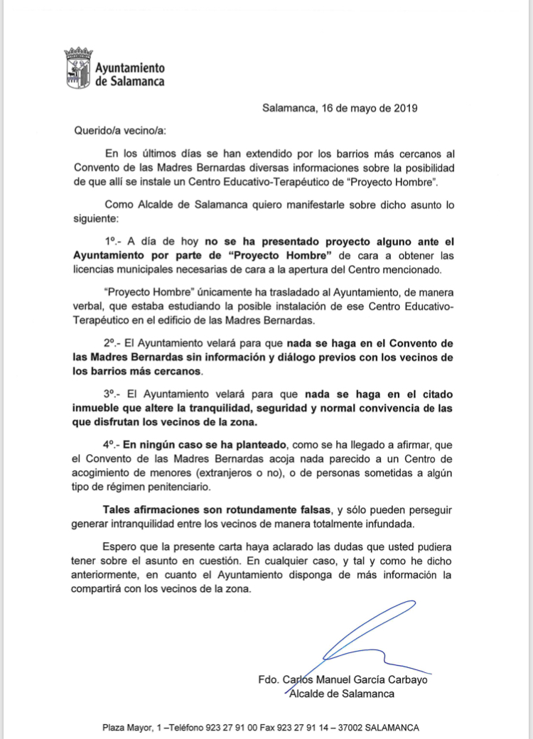 Ante las informaciones que se han extendido por los barrios más cercanos al Convento de las Madres Bernardas sobre la posibilidad de que allí se instale un Centro-Terapéutico de “Proyecto Hombre”, el alcalde de Salamanca, Carlos García Carbayo, ha enviado una carta a los vecinos en la que asegura que “Proyecto Hombre” no ha presentado proyecto alguno ante el Ayuntamiento de cara obtener las licencias municipales necesarias para la apertura.