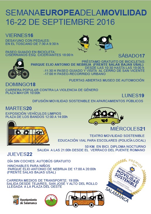 Con el objetivo de promover la movilidad sostenible, el Ayuntamiento de Salamanca ha organizado un variado y completo programa pensado para todas las edades y similar al desarrollado el pasado año ante la buena acogida de los ciudadanos y que permitió obtener a la ciudad el Premio por el Ministerio de Agricultura, Alimentación y Medio Ambiente. Los actos comenzarán este viernes, 16 de septiembre, con un “Desayuno con pedales” que podrán disfrutar las personas que se desplacen en bicicleta desde las 7:30 a 9:30 horas en el Toscano.