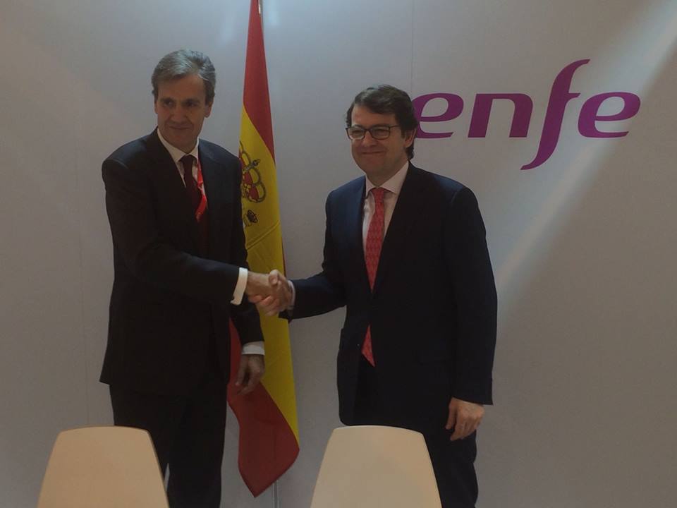 El presidente de Renfe, Juan Alfaro Grande, y alcalde de Salamanca, Alfonso Fernández Mañueco, han firmado esta mañana en Fitur un acuerdo de colaboración para fomentar la promoción y comercialización conjunta de Salamanca como destino turístico, especialmente en el sector de los congresos, ligado a la utilización de los servicios de transporte ferroviario. Renfe tendrá la consideración de “Transportista oficial” y ofrecerá descuentos a los viajeros y grupos que visiten la ciudad dentro de los acuerdos con el Ayuntamiento.