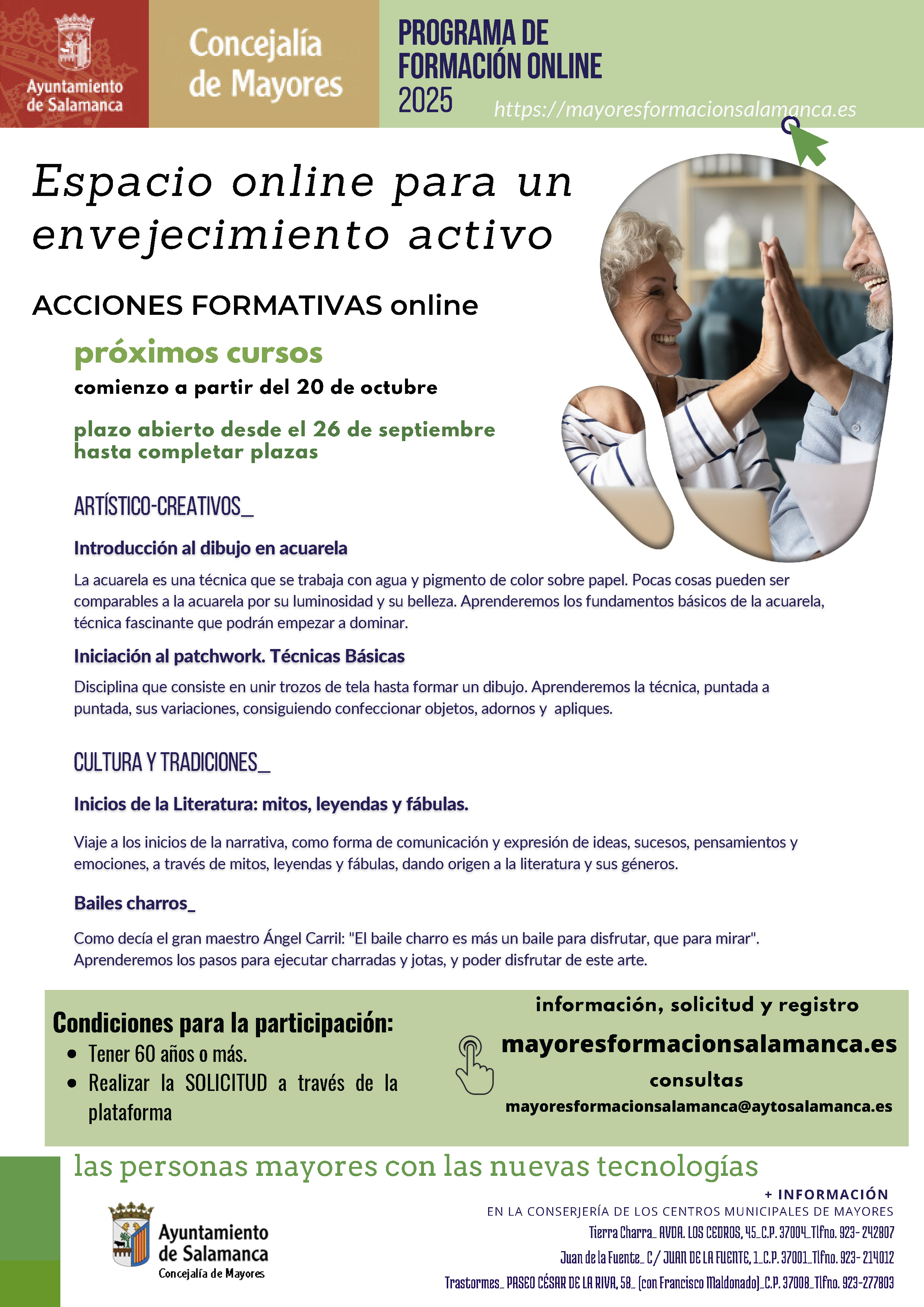 El Ayuntamiento de Salamanca pone en marcha el 20 de octubre nuevas acciones formativas online y gratuitas para personas mayores de 60 años