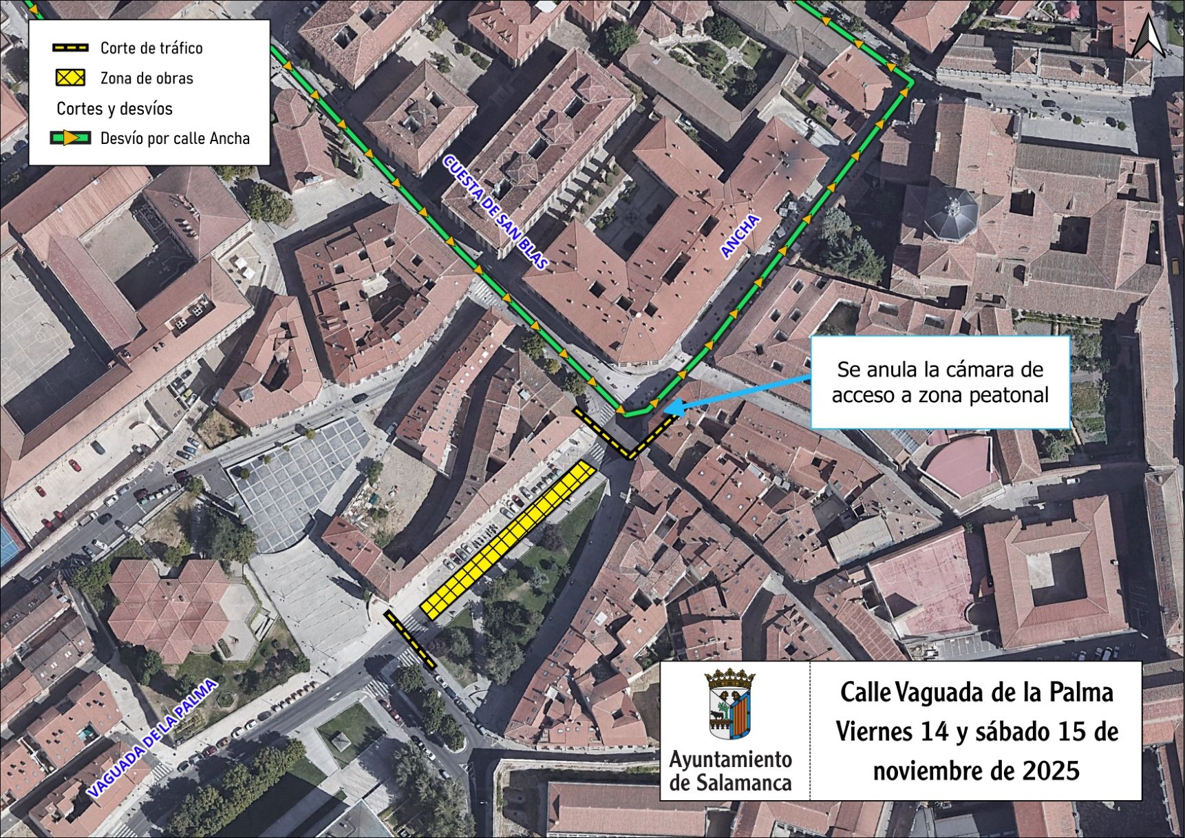 La calle Vaguada de la Palma, entre la Cuesta de San Blas y la plaza Donados, permanecerá cerrada al tráfico durante las jornadas del viernes y el sábado, debido a la realización de trabajos de reparación de la calzada. Como itinerario alternativo, se podrán utilizar las calles Ancha y Ramón y Cajal, que durante esos dos días no tendrán activos los lectores de matrículas que regulan el acceso a esta zona.
