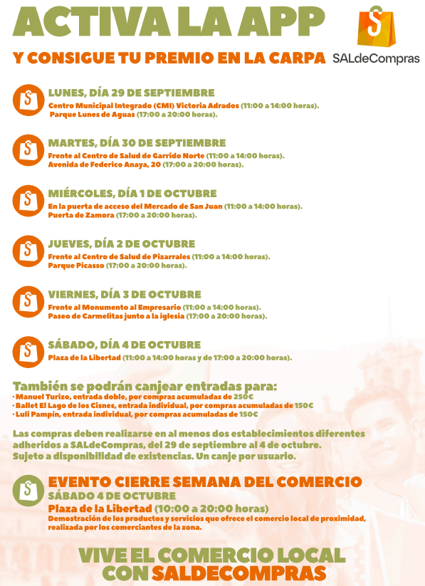 Asimismo, en dicha carpa también se podrán canjear entradas para el concierto de Manuel Turizo (entrada doble por compras acumuladas de 250 euros o más en al menos dos comercios diferentes), el Ballet El Lago de los Cisnes y Luli Pampín (entrada individual por compras acumuladas de 150 euros o más en al menos dos comercios diferentes), por compras realizadas en establecimientos adheridos a SALdeCompras durante la Semana del Comercio. Todo ello sujeto a disponibilidad de existencias.