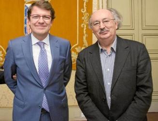 El alcalde de Salamanca, Alfonso Fernández Mañueco, en nombre de la Corporación Municipal y de la ciudad, felicita al escritor Antonio Colinas tras haber obtenido el máximo galardón de poesía en lengua española, el premio Reina Sofía de Poesía Iberoamericana.