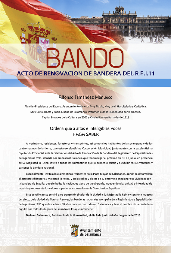 El alcalde de Salamanca, Alfonso Fernández Mañueco, anima a los salmantinos a que engalanen sus viviendas con la bandera de España el próximo lunes ,13 de junio, con motivo de la visita de Su Majestad la Reina, que presidirá el Acto de Renovación de la Bandera del Regimiento de Especialidades de Ingenieros nº11. La nueva enseña ha sido donada por el Ayuntamiento de Salamanca y la Diputación Provincial.