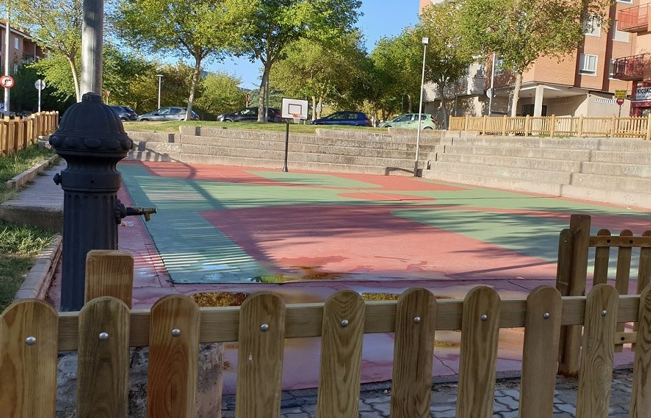 Las mejoras llevadas a cabo también se han centrado en la pista deportiva, donde se han incorporado dos canastas y se ha pintado el pavimento para crear una pista de minibasket, ya que cumple con las medidas reglamentarias. Además, se ha colocado una valla de madera para evitar que los balones salgan a la calzada. También se han limpiado todas las gradas para renovar su imagen.