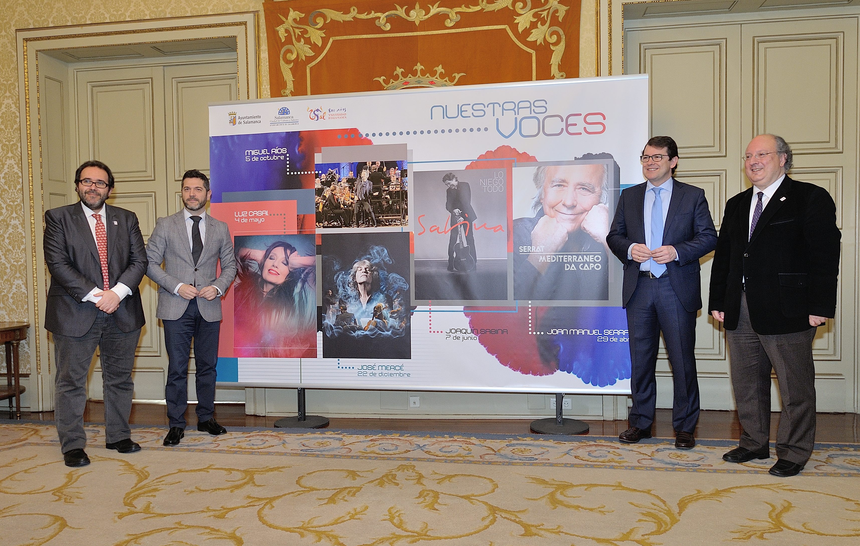 El alcalde de Salamanca, Alfonso Fernández Mañueco, y el vicerrector de Política Académica y Participación Social de la Universidad de Salamanca, Enrique Cabero, han presentado esta mañana el ciclo “Nuestras voces”, cinco conciertos organizados por el Ayuntamiento para conmemorar los 800 años de nuestra universidad. Las actuaciones de Joan Manuel Serrat, Luz Casal, Joaquín Sabina, Miguel Ríos y José Mercé se suman a la oferta de actividades culturales del 2018.