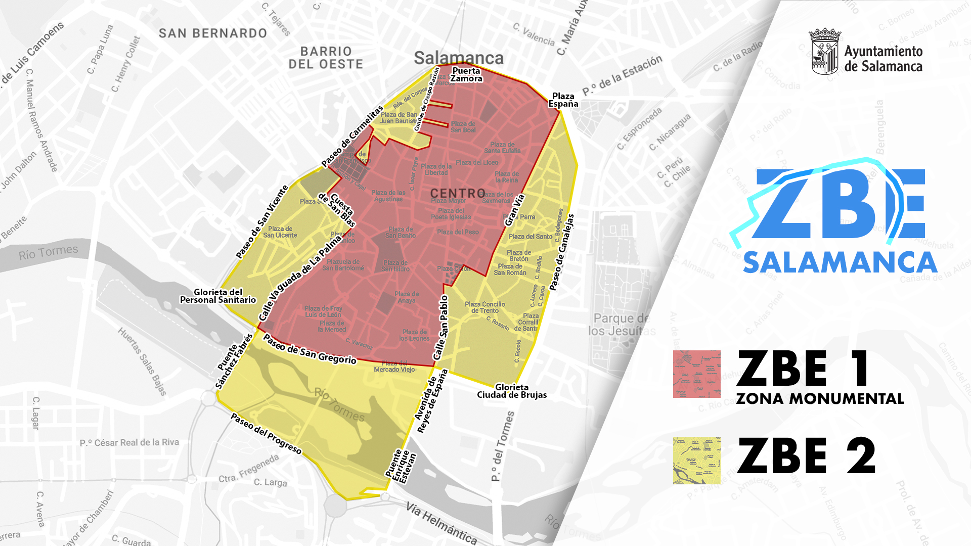 - ‘Zona de Bajas Emisiones 2 y comprende todas las vías incluidas en el siguiente perímetro: puerta de Zamora, avenida de Mirat, plaza de España, paseo de Canalejas, glorieta Ciudad de Brujas, paseo del Rector Esperabé, puerta de San Pablo, avenida de Reyes de España, puente Enrique Estevan, parking junto a la iglesia de la Santísima Trinidad, glorieta Virgen de Loreto, Vía Helmántica, glorieta de Vettones y Vacceos, paseo del Progreso, glorieta de la Charrería, puente Sánchez Fabrés, glorieta de los Milagros, paseo del Desengaño, glorieta del Personal Sanitario, paseo de San Vicente y paseo de Carmelitas.