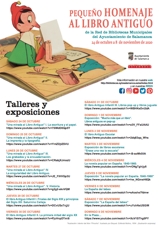 Este año, debido a las restricciones impuestas con motivo de la pandemia del coronavirus, el Ayuntamiento de Salamanca ha elaborado una programación especial que podrá seguirse del 24 de octubre al 8 de noviembre a través del canal de YouTube del Ayuntamiento (https://www.youtube.com/user/aytosala) y de la Red de Bibliotecas Municipales (https://www.youtube.com/channel/UCTIsd9fvX4IC5_19AewwJJA).