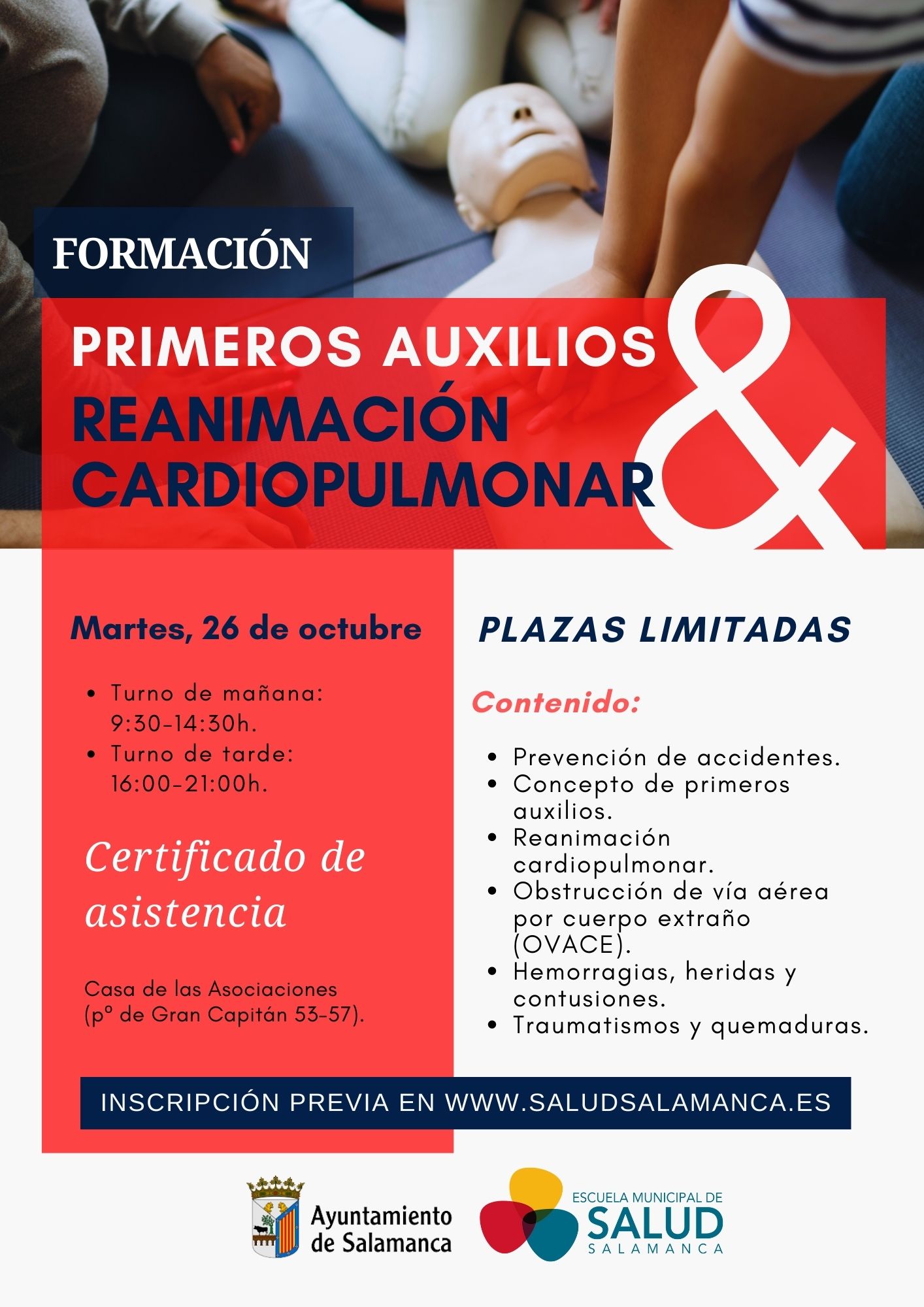 El Ayuntamiento de Salamanca continúa con su programa de formación a la población para que adquiera conocimientos y habilidades en situaciones de emergencia, así como pautas de conducta para la prevención de accidentes. La Escuela Municipal de Salud oferta dos nuevos cursos de primeros auxilios y reanimación cardiopulmonar, que se llevarán a cabo el 26 de octubre en la Casa de las Asociaciones (Gran Capitán, 53) de forma presencial en turno de mañana (de 9:30 a 14:30 horas) y de tarde (de 16:00 a 21:00 horas).