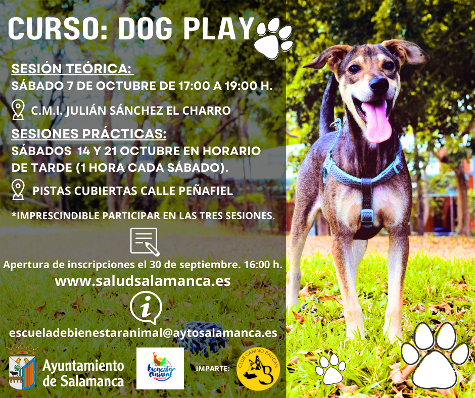 El Ayuntamiento de Salamanca oferta, en el marco de las actividades de la Escuela Municipal de Salud y en colaboración con el Club Canino Baucan, un curso de ‘dog play’ para favorecer la educación y tenencia responsable de animales de compañía. El objetivo principal es enseñar a los perros a través de retos dinámicos y divertidos que permitan crear un vínculo con la persona, evitando actitudes repetitivas que pueden generar una conducta obsesiva en el animal.