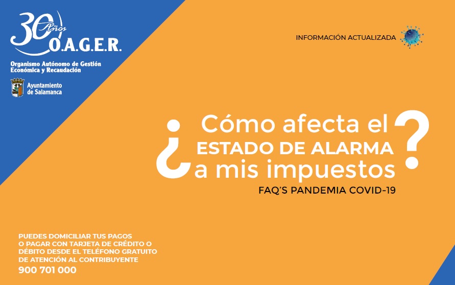 El Ayuntamiento de Salamanca, a través del Organismo Autónomo de Gestión Económica y Recaudación (OAGER), ha editado una completa guía digital para informar a los ciudadanos sobre las facilidades que el Consistorio da a familias y empresas para el pago de los tributos locales durante el estado de alarma sanitario.