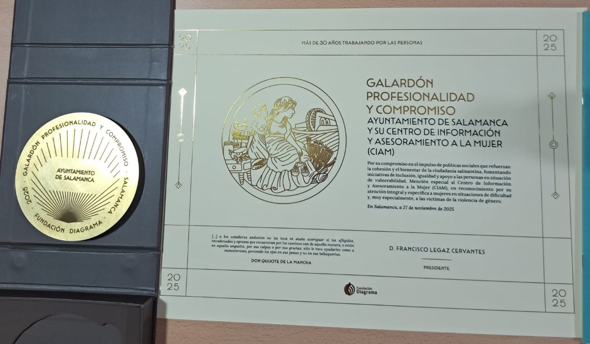 La Fundación Diagrama Intervención Psicosocial ha entregado unos de sus Galardones ‘Profesionalidad y Compromiso’ al Centro de Información y Asesoramiento a la Mujer (CIAM) del Ayuntamiento de Salamanca, en reconocimiento y agradecimiento a la profesionalidad, dedicación, esfuerzo, responsabilidad y compromiso social, humano y solidario para contribuir a la construcción de una sociedad más igualitaria, justa y solidaria.