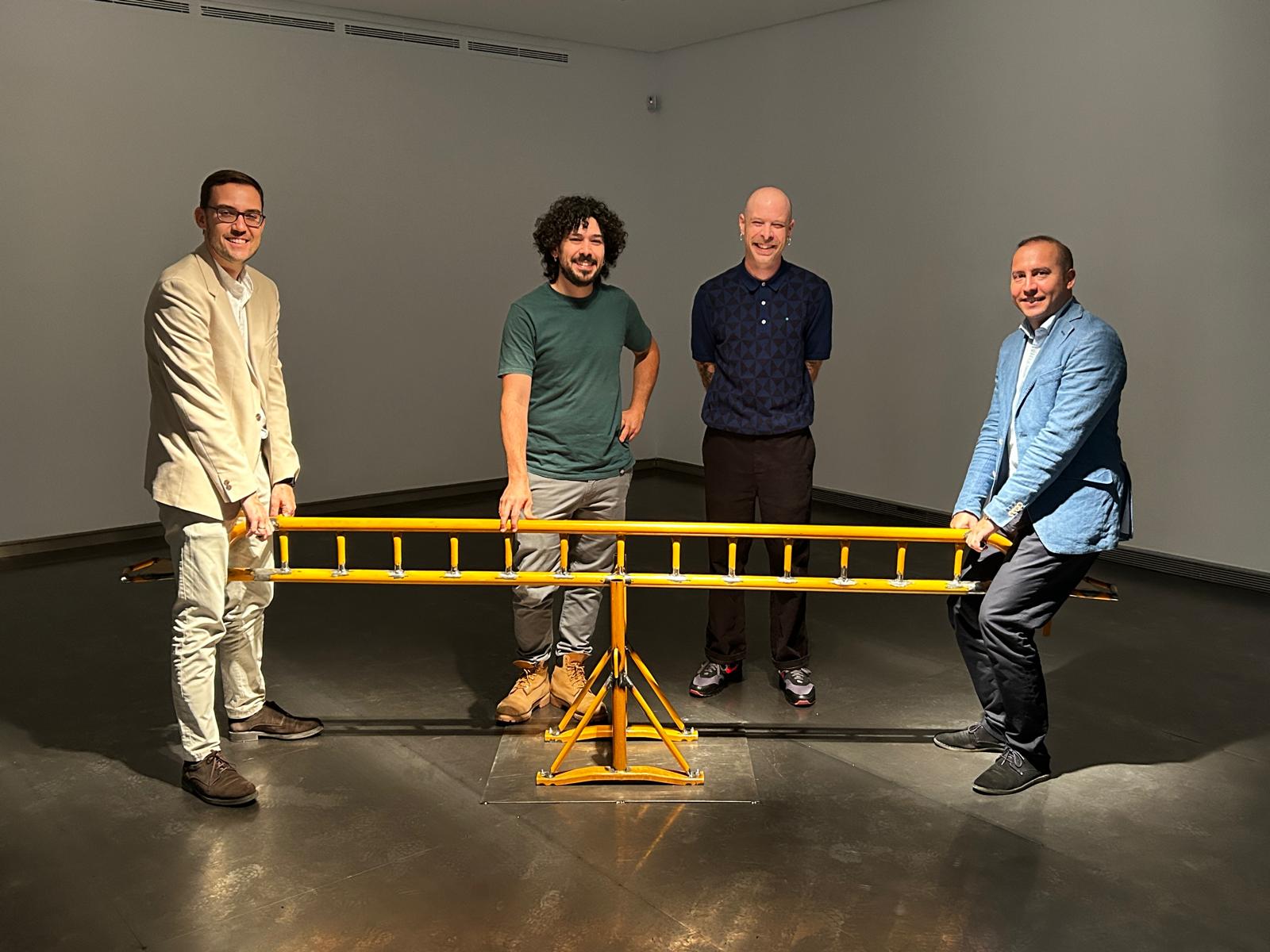 En “Prohibido prohibir” Adrián Castañeda parte de un objeto tan reconocible como cotidiano —la valla amarilla de la calle, esa barrera que nos detiene, nos limita o nos impide avanzar— y lo transforma en su materia de juego, convirtiéndolo en un punto de partida para ampliar el imaginario sobre lo que se puede —y no se puede— hacer en el espacio común, la calle.