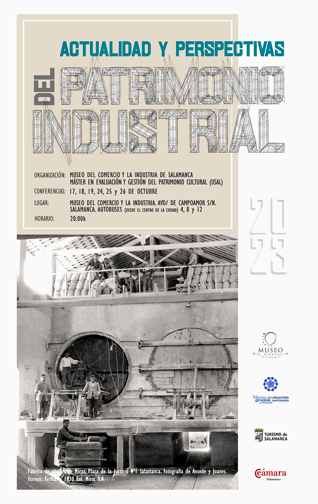 Estas jornadas tendrán lugar los próximos días 17, 18, 19, 24, 25 y 26 de octubre a las 20:00 horas y estarán abiertas a todos los salmantinos y visitante, ya que la entrada es libre hasta completar aforo. Incluyen un ciclo de conferencias organizadas por el Museo del Comercio y la Industria junto con el Máster Universitario en Evaluación y Gestión del Patrimonio Cultural de la Universidad de Salamanca (USAL).