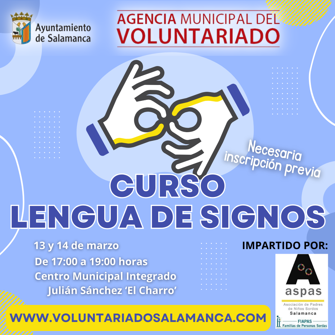 El Ayuntamiento de Salamanca continúa desarrollando actividades para promover el voluntariado en la ciudad. Dentro del programa ‘VoluntaS’, la Agencia  Municipal de Voluntariado oferta un curso de formación específica en lengua de signos, que tendrá lugar el 13 y 14 de marzo de 17:00 a 19:00 horas en el Centro Municipal Integrado (CMI) Julián Sánchez ‘El Charro’.