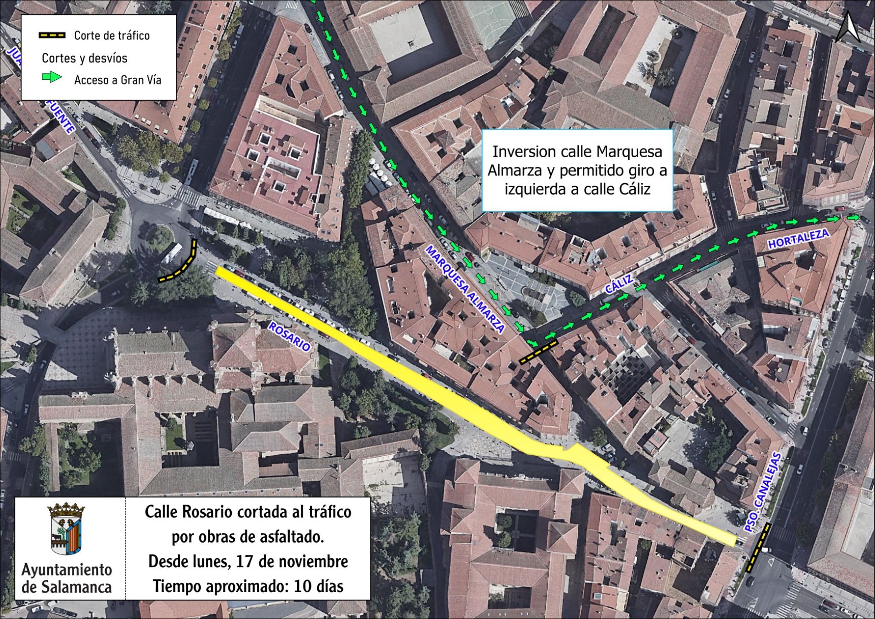 La calle Rosario permanecerá cerrada al tráfico desde este lunes, 17 de noviembre, debido a la realización de trabajos de renovación del firme de la calzada. Permanecerá cortada mientras se acometan estos trabajos, para los que se estima una duración aproximada de diez días. Durante este mismo tiempo, la calle Marquesa de Almarza invertirá el sentido de la circulación, permitiendo el giro a la izquierda hacia la calle Cáliz para acceder al paseo de Canalejas.