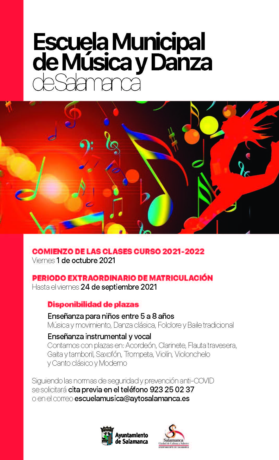 Con la finalidad de completar los diferentes grupos y especialidades instrumentales, la Escuela Municipal de Música y Danza de Salamanca abre un periodo extraordinario de matriculación hasta el próximo viernes 24 de septiembre. Siguiendo con las medidas de seguridad y de prevención anti Covid, las personas interesadas en las plazas vacantes pueden solicitar cita previa a través del teléfono 923 25 02 37 en horario de lunes a viernes de 9:00 h a 14:00 h.