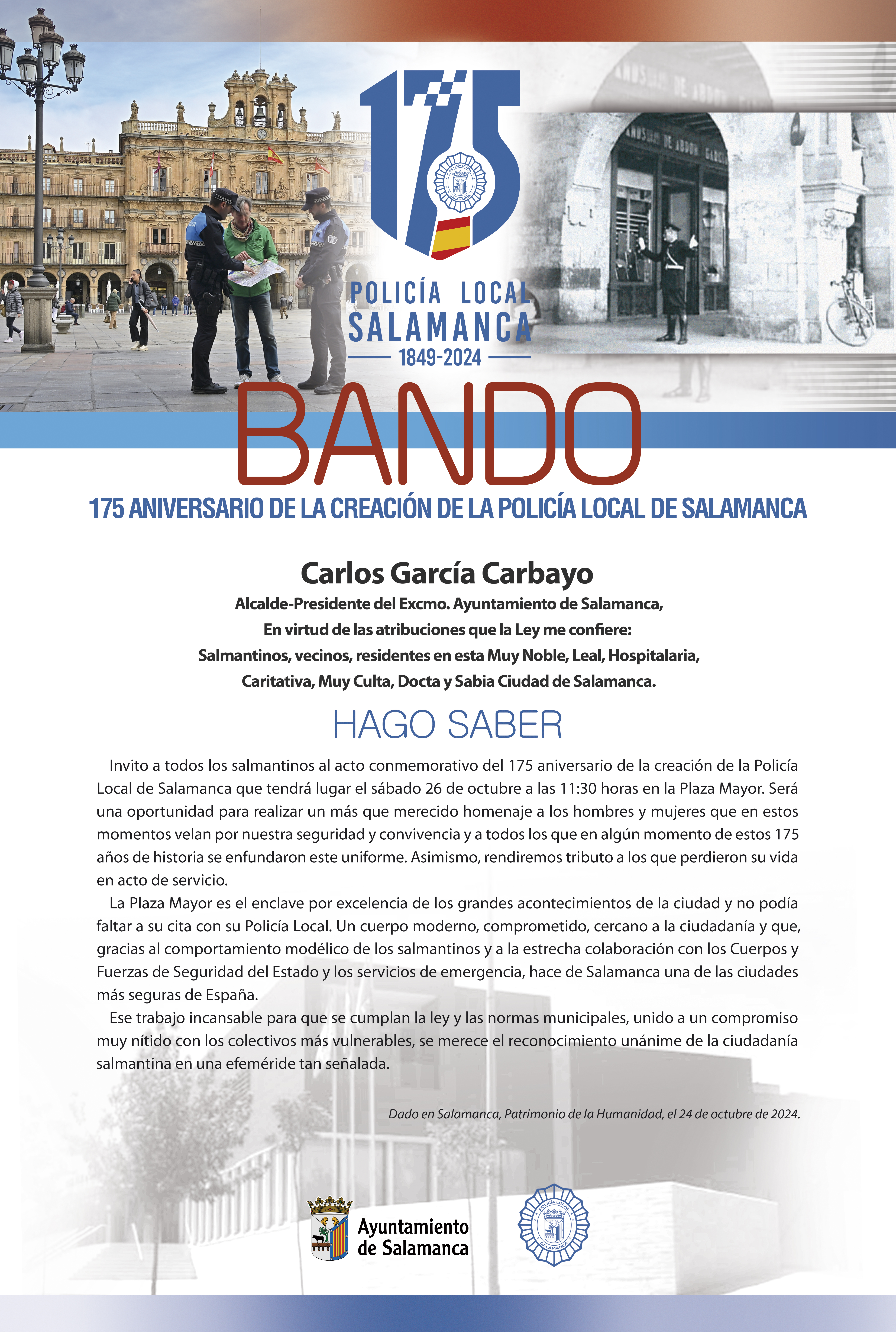 La Policía Local de Salamanca celebrará este sábado en la Plaza Mayor un acto conmemorativo y de homenaje con motivo de la celebración del 175 aniversario de la creación del Cuerpo. En el acto, que dará comienzo a las 11:30 horas, participarán más de 200 agentes uniformados, además de veteranos. La formación también estará integrada por una representación histórica, que lucirá algunos de los uniformes que han representado al Cuerpo a lo largo de estos 175 años.