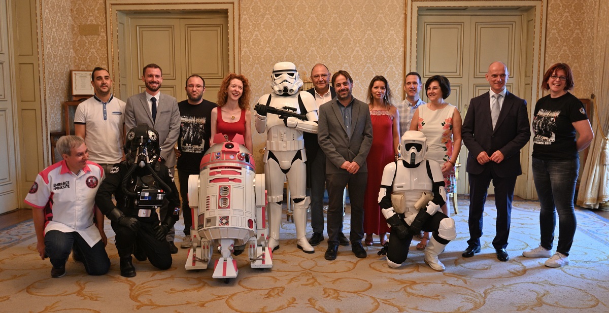 El concejal de Turismo del Ayuntamiento de Salamanca, Fernando Castaño Sequeros, acompañado de Alicia Santos e Ibán Hernández, representantes de la Legión 501 y de Jesús Alberto Martín Herrero, presidente de Aspace, han presentado en el Salón de Recepciones del Consistorio salmantino las actividades que se van a realizar en la capital el 5 de octubre, con motivo del Training Day. Esta jornada acogerá el desfile de la Legión 501 y hasta el momento se han apuntado más de 500 personas quienes, vestidas con los trajes de Star Wars, realizarán un recorrido de kilómetro y medio por algunas de las principales calles y plazas para concluir en la Plaza de Anaya, donde habrá instalado un photocall solidario de Aspace.