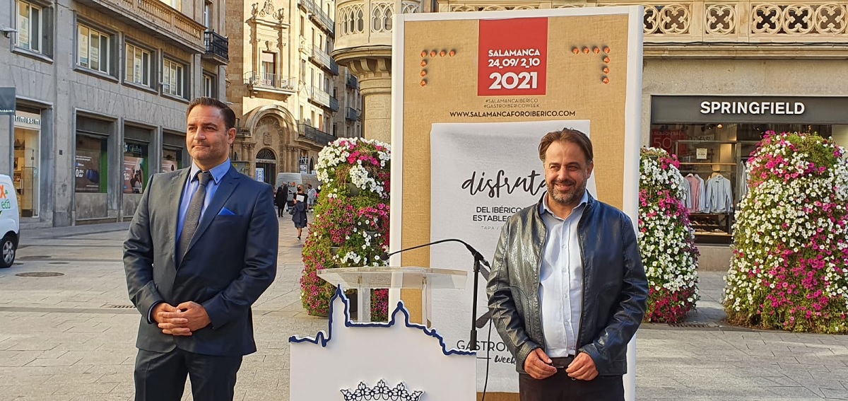 El concejal de Turismo, Fernando Castaño, y el presidente de la Asociación de Empresarios de Hostelería de Salamanca, Álvaro Juanes, han presentado hoy los detalles de la III Gastroibérico Week, que desde mañana y hasta el 2 de octubre ofrecerá la posibilidad de degustar en 27 establecimientos de la ciudad variadas tapas, platos y menús en los que el ibérico es el producto estrella.