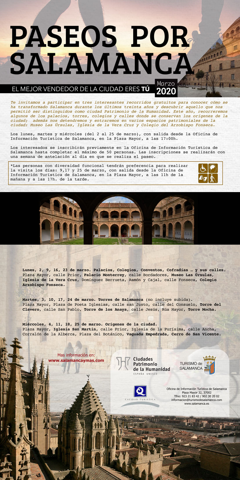 Se realizarán los lunes, martes y miércoles (del 2 al 25 de marzo), con salida desde la Oficina de Información Turística de Salamanca, en la Plaza Mayor, a las 17:00 horas.