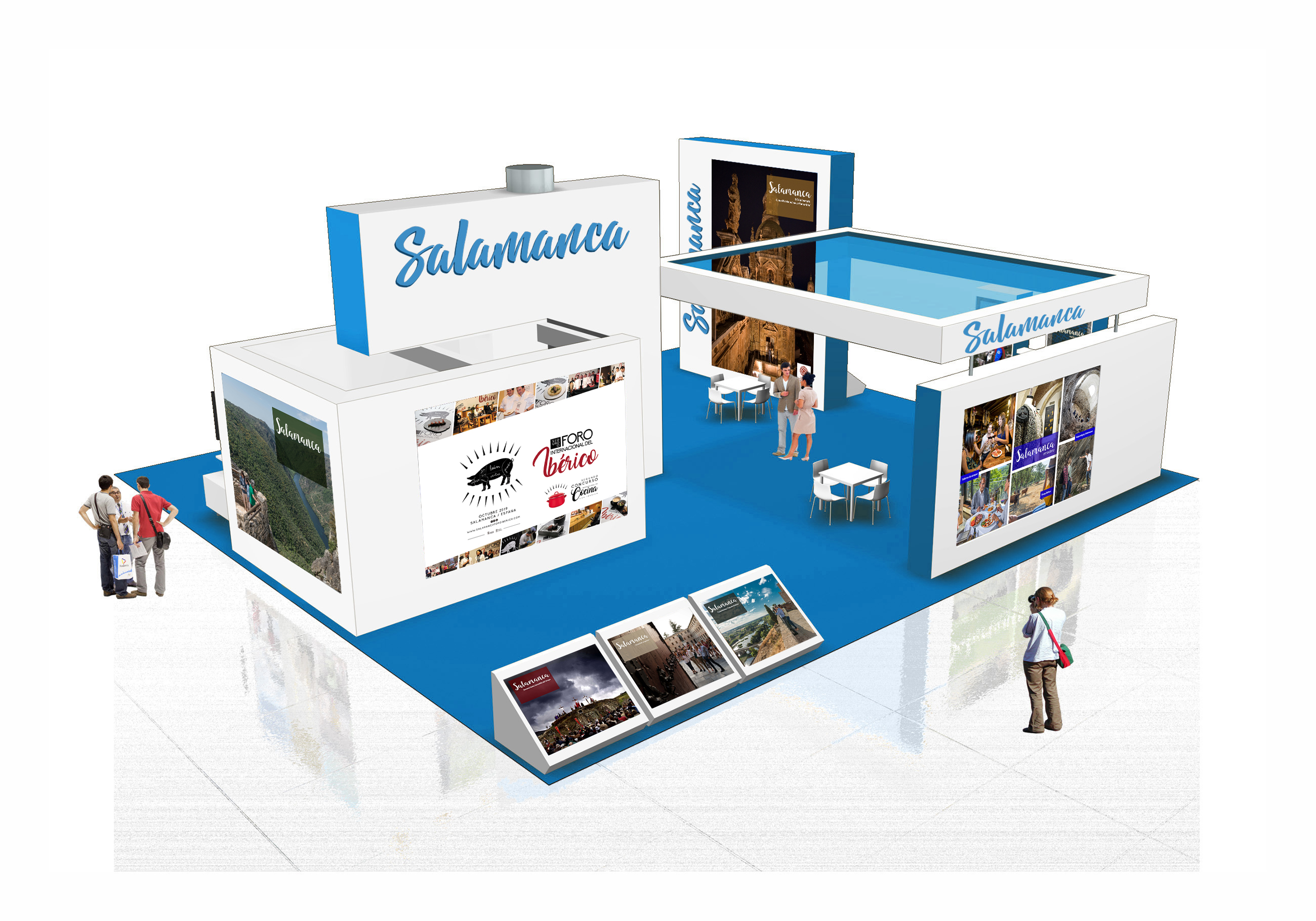 El stand presenta en esta edición un diseño abierto, con una distribución de espacios que tiene en cuenta el flujo de visitantes. El espacio se ha organizado a partir de estructuras de madera a distintas alturas y formas, con una amplia gráfica de grandes proporciones, enmoquetado a nivel y corpóreo de Salamanca a diferentes alturas, que ofrece visibilidad.