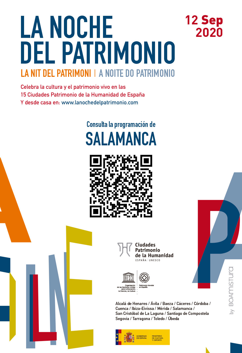 La Noche del Patrimonio estará estructurada en tres secciones comunes a las quince ciudades: ESCENA PATRIMONIO, que es un festival y plataforma de creación para la Danza en espacios patrimoniales; ABIERTO PATRIMONIO, que consiste en puertas abiertas de monumentos y espacios culturales; y VIVE PATRIMONIO, que incluye una gran oferta cultural y de ocio que se repartirá por sus cascos históricos.
