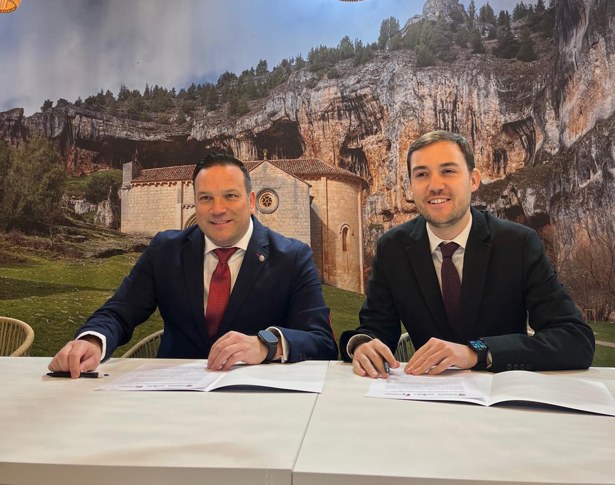 El concejal de Turismo, Ángel Fernández Silva y el presidente de la Asociación de Empresarios de Hostelería de Salamanca, Jorge Moro, han firmado este viernes en Fitur un protocolo de intenciones con el que continuar impulsando iniciativas conjuntas que eleven la calidad de los servicios, fortalezcan la oferta local y mejoren de forma integral la experiencia turística en la ciudad.