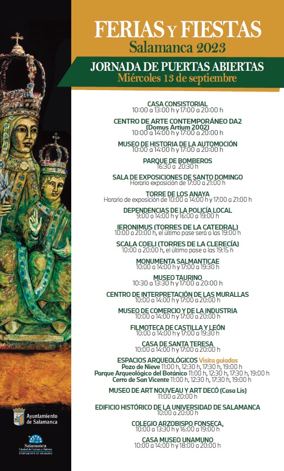 Los horarios de visita son los siguientes: la Casa Consistorial se podrá visitar de 10:00 a 13:00 y de 17:00 a 20:00 horas; Ieronimus (Torres de la Catedral) de 10:00 a 20:00 horas, el último pase será a las 19:00 horas; Scala Coeli (Torres de la Clerecía), de 10:00 a 20:00 horas, el último pase será a las 19:15 horas; el Centro de Interpretación del Patrimonio Urbano Monumental Salmanticae estará abierto de 10:00 a 14:00 y de 17:00 a 19:30 horas; el Centro de Arte Contemporáneo DA2, de 10:00 a 14:00 y de 17:00 a 20:00 horas; la Sala de Exposiciones de Santo Domingo abrirá de 17:00 a 21:00 horas; el Museo Taurino, de 10:30 a 13:30h y de 17:00 a 20:00 horas; el Museo del Comercio, de 10:00 a 14:00 y de 17:00 a 20:00 horas; el Museo de Historia de la Automoción, de 10:00 a 14:00 y de 17:00 a 20:00 horas; el Museo de Art Nouveau y Art Decó, de 11:00 a 20:00 horas; el Centro de interpretación de las Murallas Salmantinas, de 10:00 a 14:00 horas y de 17:00 a 20:00 horas; el edificio histórico de la Universidad se pueden visitar de 10:00 a 20:00 horas; el Colegio Arzobispo Fonseca permanecerá abierto de 10:00 a 13:30 h y de 16:00 a 19:00 horas; la Casa Museo Unamuno abrirá sus puertas de 10:00 a 14:00 horas y de 18’00 a 20’00 horas; las dependencias de la Policía Local de Salamanca se pueden visitar de 9:00 a 14:00 y de 16:00 a 19:00 horas; y el Parque de Bomberos estará abierto de 17:00 a 20:00 horas.