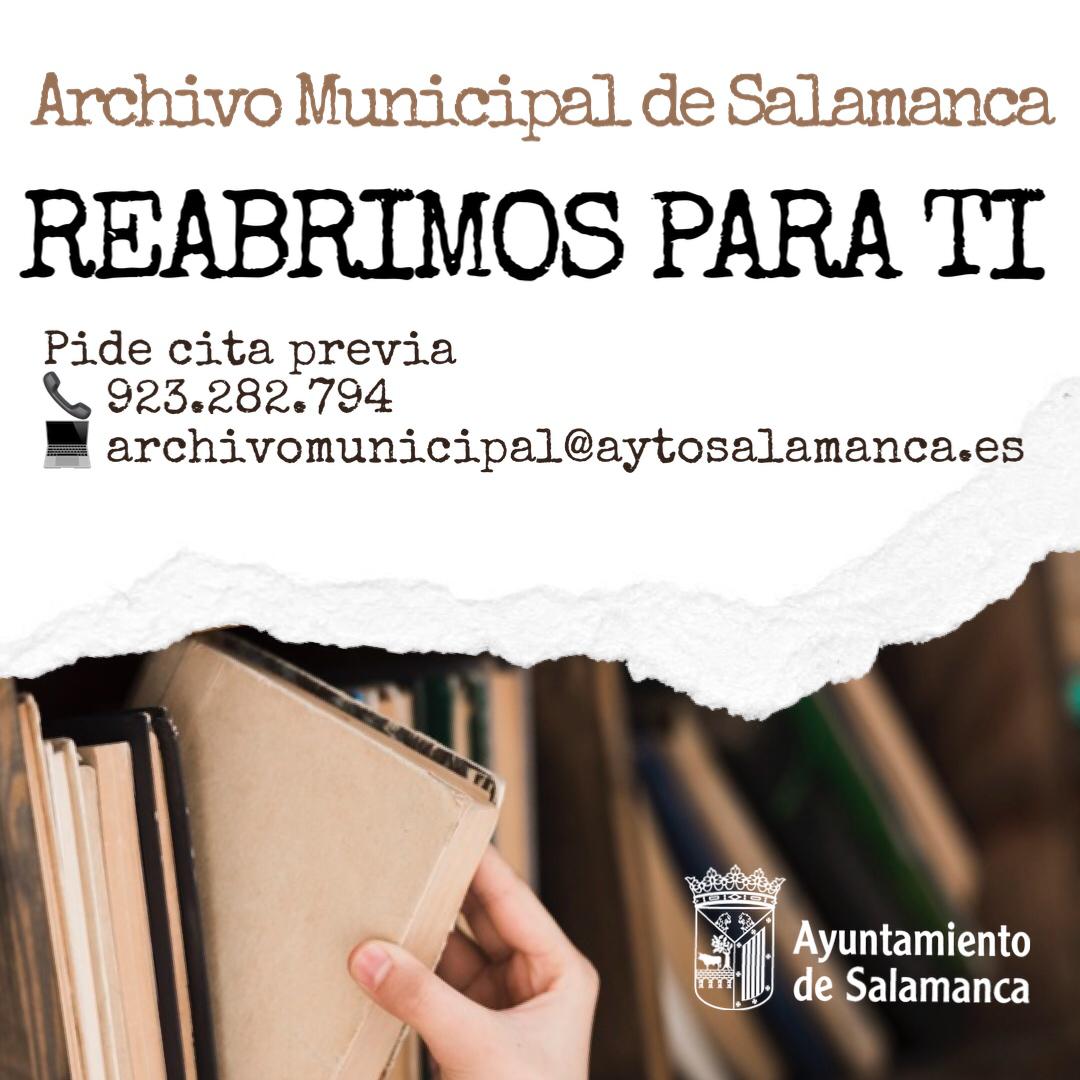 El Archivo Municipal de Salamanca volverá a abrir sus puertas a partir del próximo lunes, día 11, para la realización de consultas de documentación con fines administrativos o de investigación, que deberá solicitarse con cita previa.