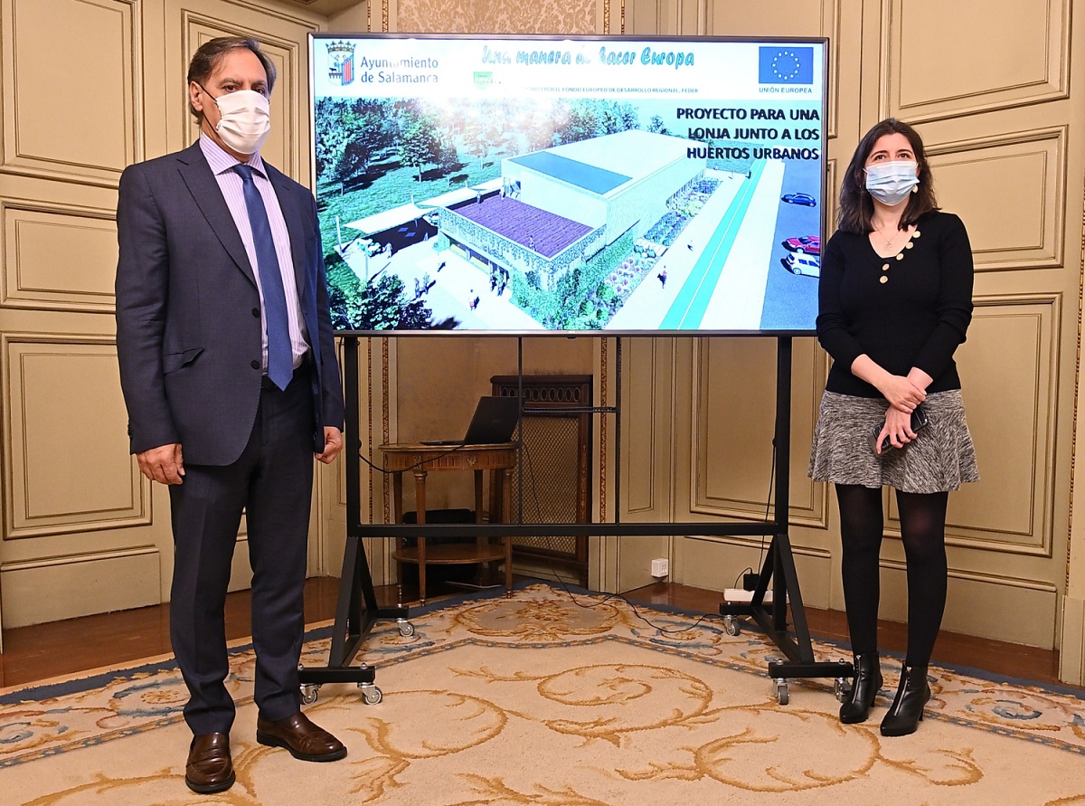 El alcalde de Salamanca, Carlos García Carbayo, ha presentado hoy el proyecto para la construcción de una lonja agroalimentaria junto a los más de 600 huertos urbanos ecológicos que el Ayuntamiento construye en Salas Bajas, entre los barrios Chamberí y Tejares, dentro de un gran parque de más de 100.000 metros cuadrados en el entorno de la ribera del río Tormes.
