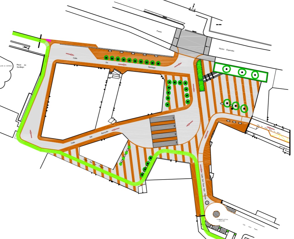 El resto de la plaza será peatonalizado, eliminando las barreras arquitectónicas y mejorando la accesibilidad para personas con discapacidad y movilidad reducida. Las calzadas estarán a nivel de acera con un color distinto cada una para diferenciarlas, con el objeto también de no establecer obstáculos para los servicios de emergencia en caso de que sea necesaria su presencia. Además, se crean dos zonas de estancia nuevas con 25 árboles, jardineras y bancos, trasplantándose las actuales acacias con valor botánico, entre el edificio de Santiago y los jardines de Rector Esperabé.