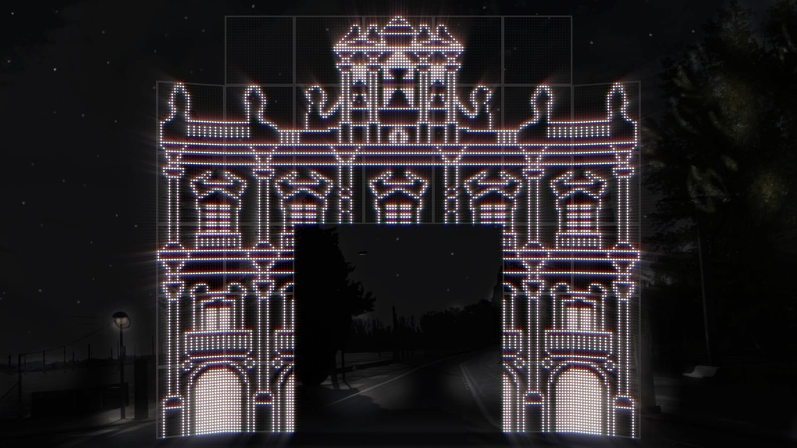 Este año, por segunda vez, el pórtico antes de la entrada al recinto ferial está formado por 31 módulos de aluminio de 2,5 x 2,5 metros con 19.375 puntos de luz LED, montados sobre estructura de hierro cuyas dimensiones totales son 17,5 metros de ancho por 15 metros de alto. El centro del pórtico permite la doble dirección de circulación de la calzada.