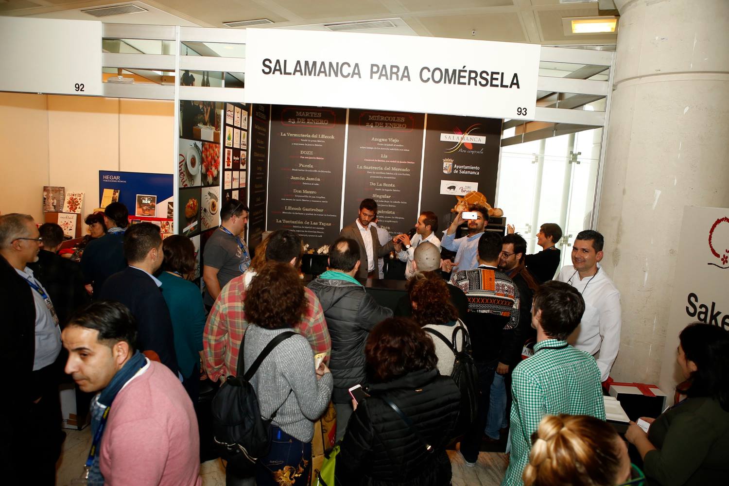 Además de los showcooking y degustaciones de las tapas, el stand de Salamanca Para Comérsela será hoy, una vez más, escenario de diferentes degustaciones a cargo de las empresas patrocinadoras. Además durante las tres jornadas se podrán degustar: ibéricos de la mano de La Hoja del Carrasco e Ibéricos Montellano, con cortador de jamón y entre otros, hornazos, pan, aceites y quesos de la tierra.