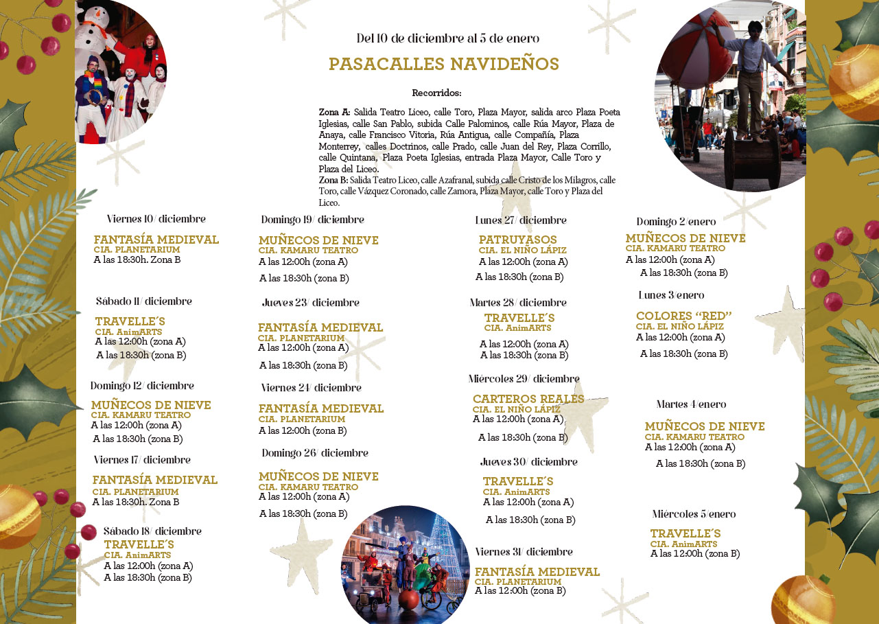 El próximo viernes, 10 de diciembre, comienzan los pasacalles navideños organizados por el Ayuntamiento de Salamanca con la participación de las compañías salmantinas Kamaru Teatro, El Niño Lápiz, Animarts y Planetarium. Hasta el 5 de enero se han programado treinta y un pases de seis espectáculos diferentes en los que veremos muñecos de nieve, los carteros reales, patruyasos, malabaristas, equilibristas, zancudos y a clowns repartiendo risas, ilusión y fantasía a niños y mayores.