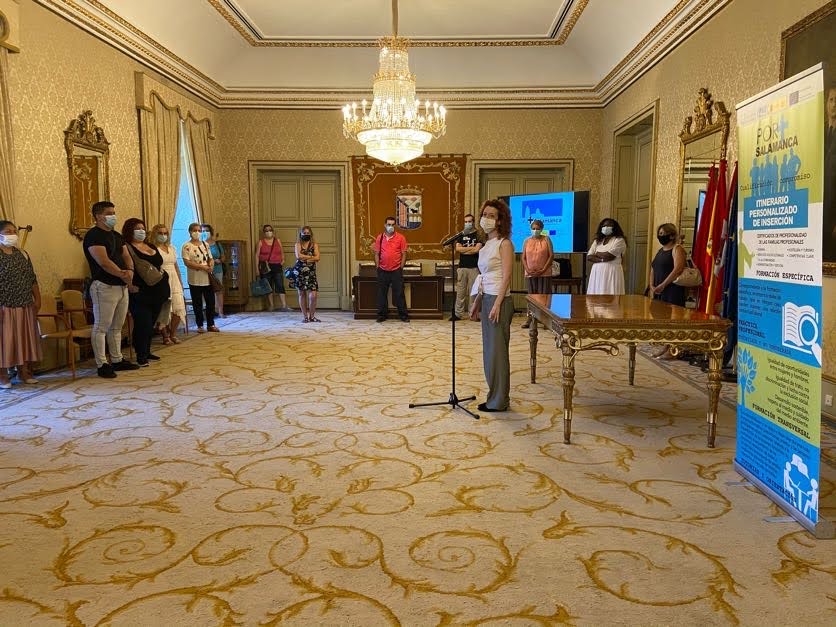La concejala de Familia e Igualdad de Oportunidades, Ana Suárez Otero, ha entregado hoy en el Salón de Recepciones del Ayuntamiento de Salamanca los diplomas de la formación ‘on line’ de los cursos desarrollados en el marco del proyecto Por+Salamanca, cofinanciado por el Fondo Social Europeo dentro del Eje Prioritario 2 del Programa Operativo de Empleo, Formación y Educación (AP-POEFE). En el acto, Ana Suárez ha manifestado que “la situación excepcional que hemos vivido en los últimos meses nos ha llevado a explorar nuevos recursos y nuevos canales de trabajo. La capacidad de reformular los objetivos y acciones que han desarrollado los técnicos del proyecto Por+Salamanca ha sido un factor clave para poner a disposición de las personas desempleadas, participantes en el Proyecto, nuevas fórmulas para acercarles al mercado laboral”.