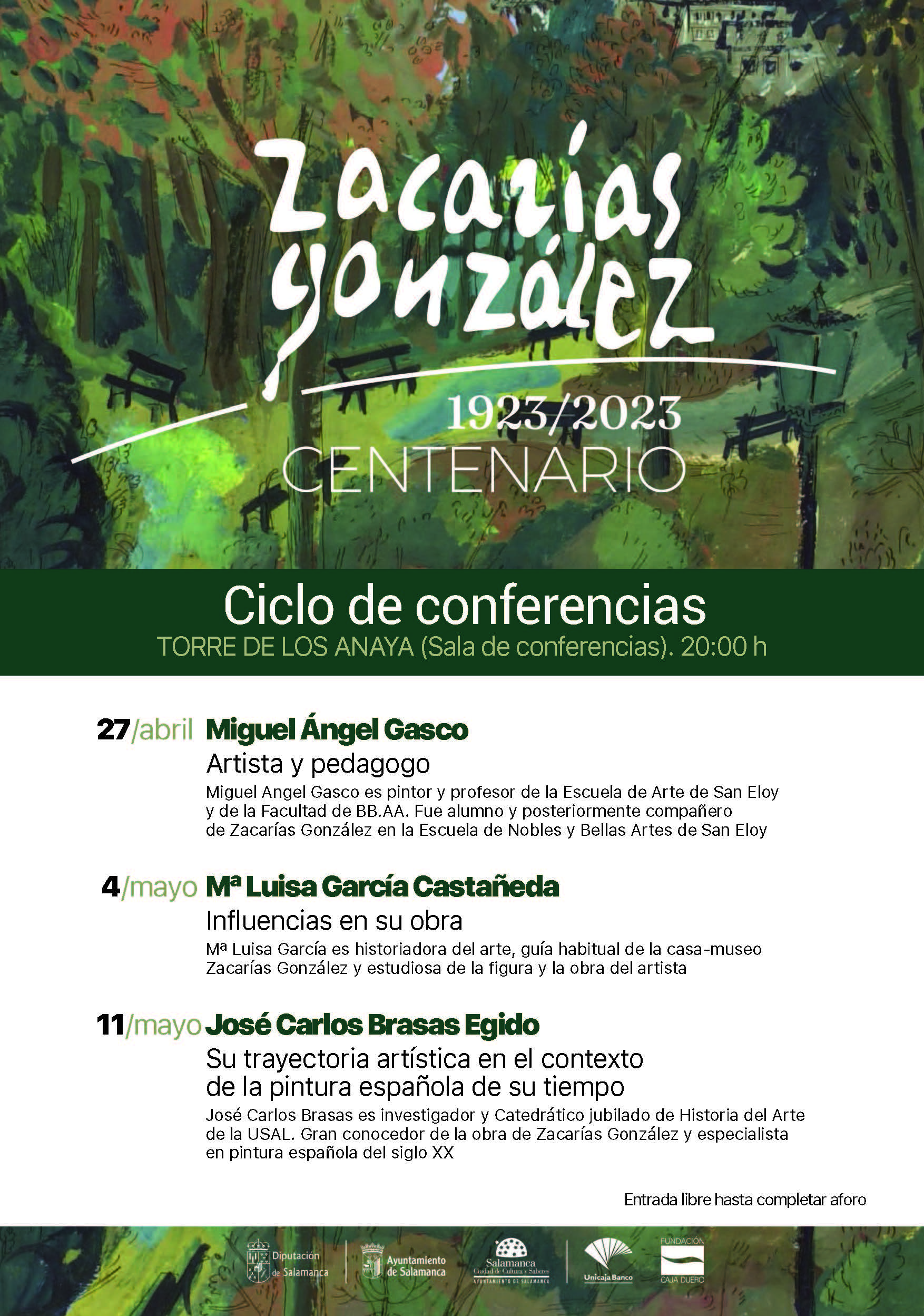El día 27 de abril tendrá lugar la conferencia 'Artista y pedagogo' impartida por Miguel Ángel Gasco, pintor y profesor de la Escuela de Arte de San Eloy y de la Facultad de Bellas Artes. Fue alumno y posteriormente compañero de Zacarías González en la escuela de Nobles y Bellas Artes de San Eloy.