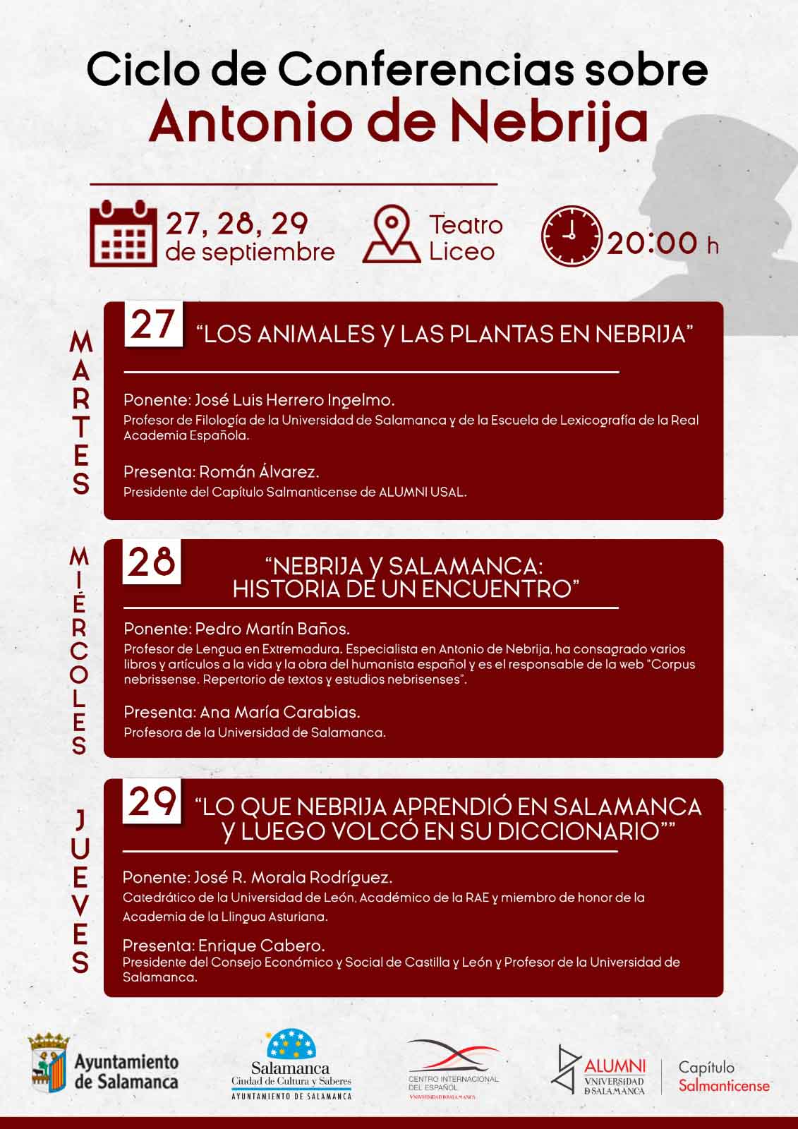 La última conferencia lleva por título “Lo que Nebrija aprendió en Salamanca y luego volcó en su diccionario” a cargo José Ramón Morala Rodríguez, catedrático de la Universidad de León, miembro correspondiente de la Real Academia Española y miembro de honor de la Academia de la Llingua Asturiana. Le presentará Enrique Cabero, presidente del Consejo Económico y Social de Castilla y León y Profesor de la Universidad de Salamanca.