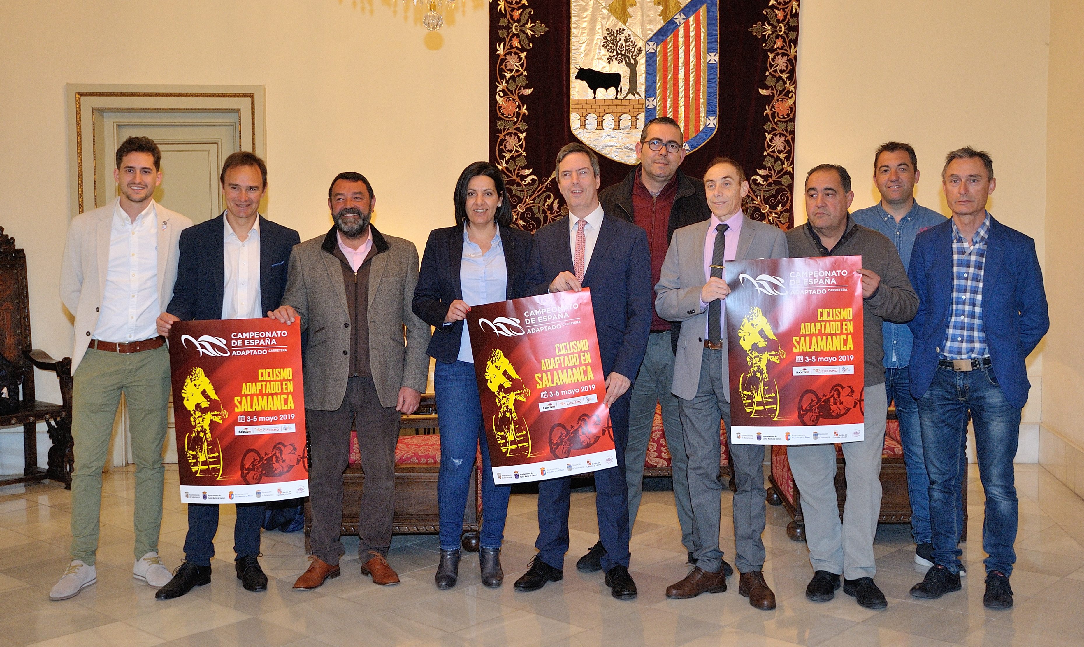Salamanca acogerá del 3 al 5 de mayo la décima edición del Campeonato de España Adaptado en Carretera. El concejal de Deportes del Ayuntamiento de Salamanca, Enrique Sánchez-Guijo, el presidente de Fucicam, Félix Rubio Naranjo, organizador del evento deportivo, el concejal de Deportes del Ayuntamiento de Villares de la Reina, José Pascua Frades, y la concejala de Deportes del Ayuntamiento de Santa Marta de Tormes, Silvia González Crespo, han presentado hoy la prueba que ha registrado un incremento del 20% en la participación respecto a la edición anterior con la presencia de 150 participantes.