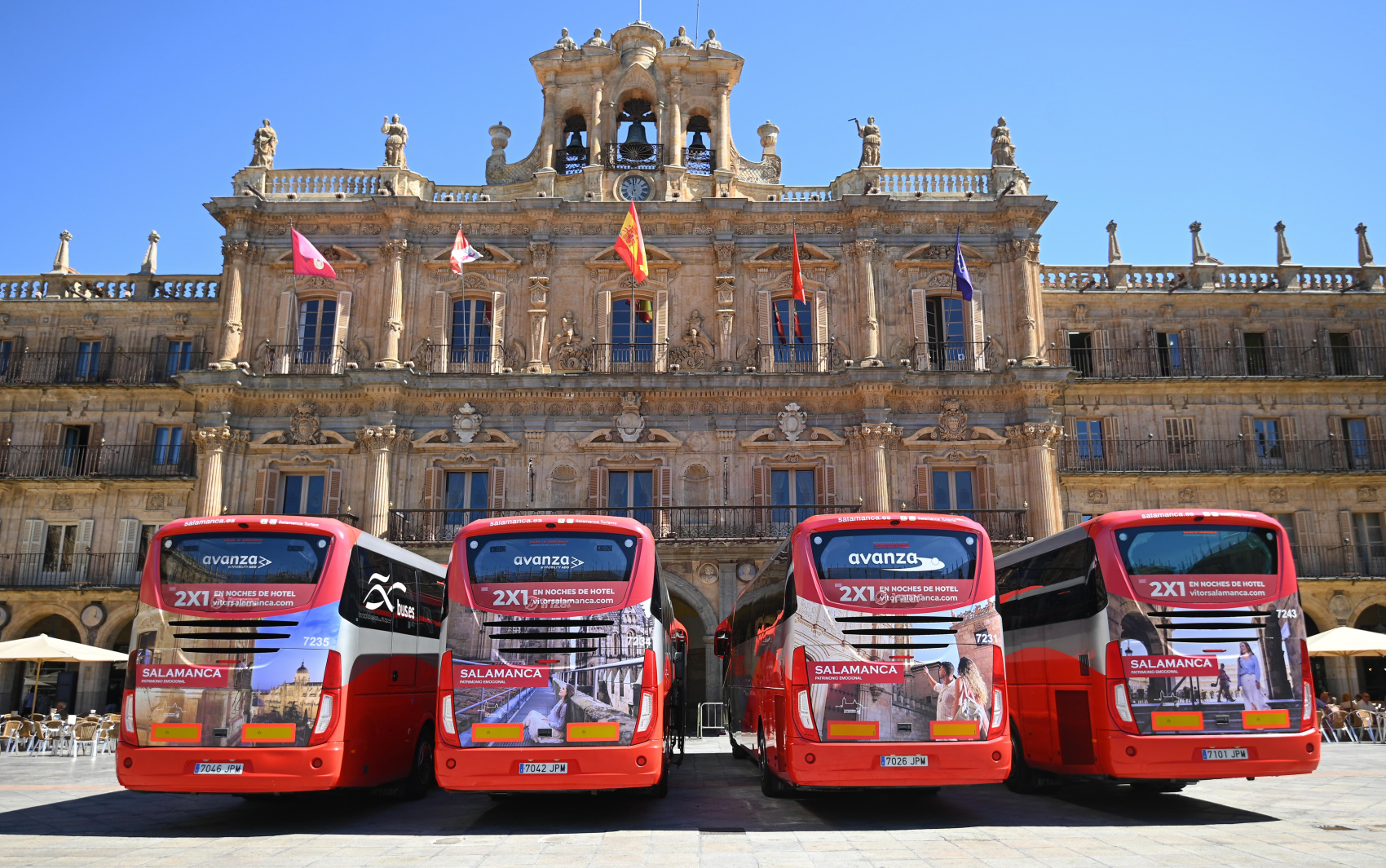 Salamanca promocionará su imagen como reclamo turístico en los autobuses del Grupo Avanza que cubren la ruta entre la ciudad y el Aeropuerto Internacional Adolfo Suárez Madrid-Barajas. Así lo ha explicado este miércoles el concejal de Turismo, Fernando Castaño, quien ha destacado la importancia de este reclamo por las miles de personas que visualizan estos vehículos. Un total de cinco autobuses estarán vinilados en su parte trasera con imágenes de espacios patrimoniales y emblemáticos de la ciudad como la Plaza Mayor, el Patio de Escuelas, el edificio histórico de la Universidad de Salamanca, Ieronimus y Scala Coelli, entre otros. Todos ellos, además, con el mensaje 'Salamanca 2x1. Redescubre la ciudad', un importante reclamo para que los turistas puedan beneficiarse del programa turístico 2x1.