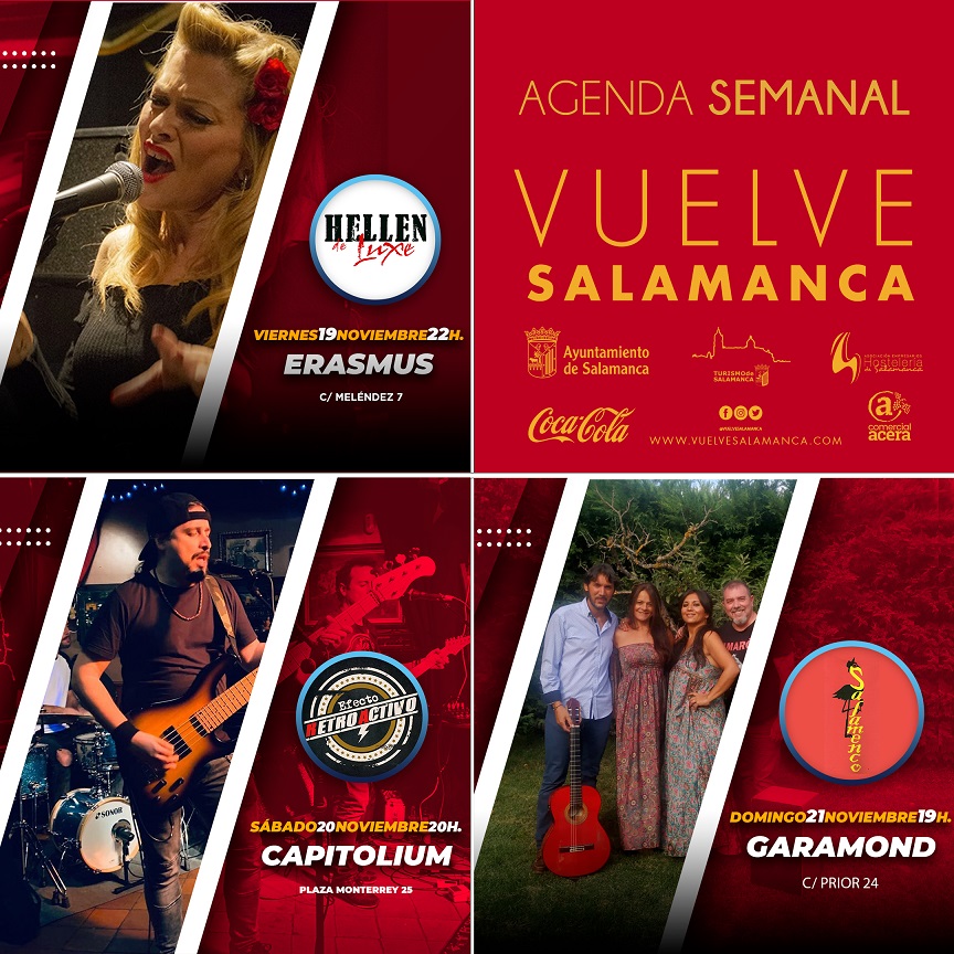 El Ayuntamiento de Salamanca, a través de la concejalía de Turismo, la Asociación de Empresarios de Hostelería, Coca Cola y Comercial Acera, impulsan en su quinto fin de semana tres nuevos eventos dentro del ciclo de conciertos que, bajo la denominación ‘Vuelve Salamanca’, impulsa las actuaciones de música en vivo como un activo que fomente la recuperación del sector del ocio nocturno.
