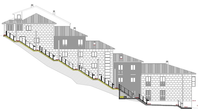 Teniendo en cuenta el ancho de cuatro metros definido por el muro de cerramiento y la fachada de la edificación limítrofe, así como la diferencia de cota de 16,2 metros y la longitud de 42 metros en proyección horizontal, se ha proyectado una escalera con un ancho de 1,40 en nueve tramos con sus correspondientes mesetas de 1,40 metros.