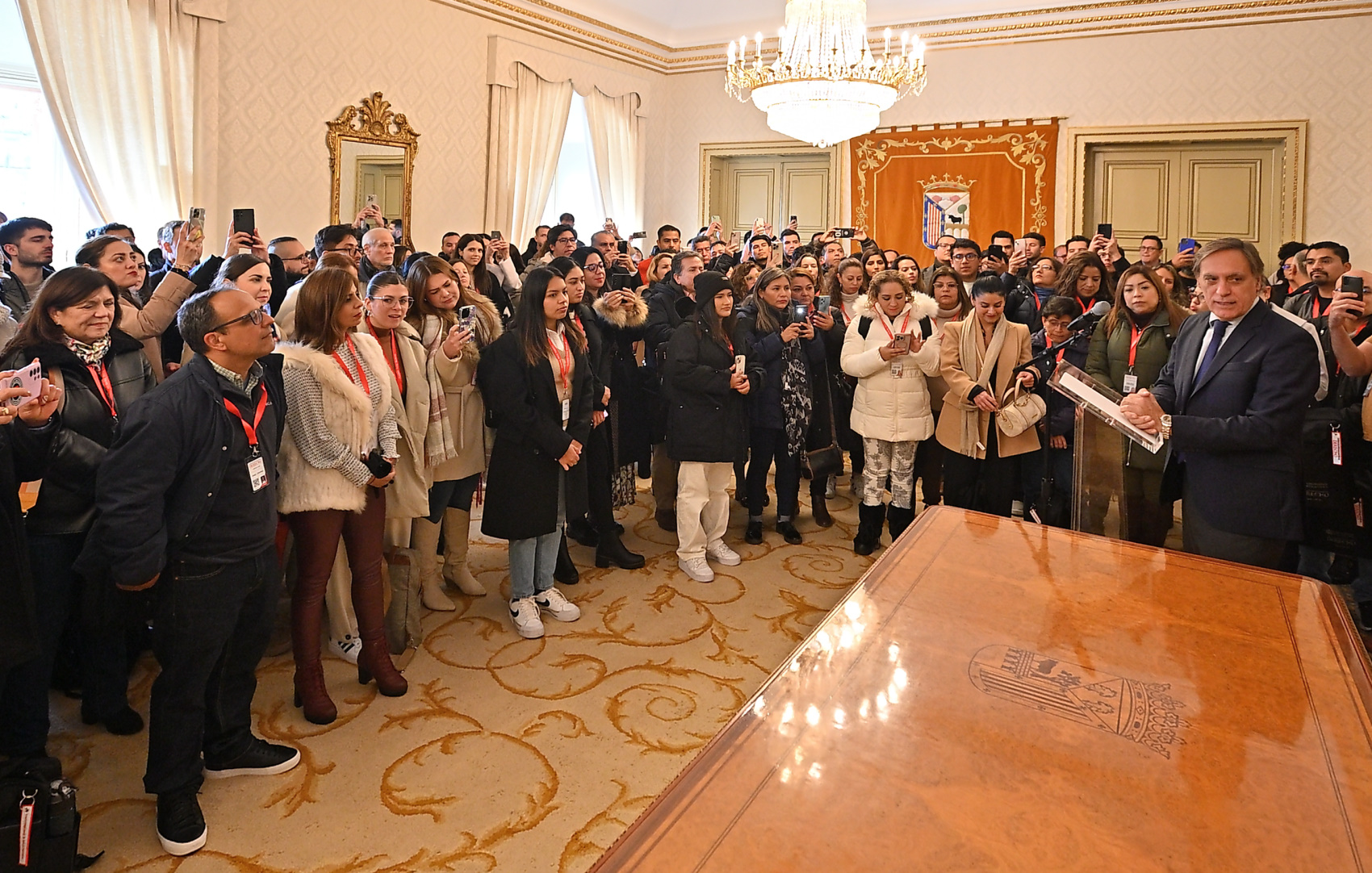 El alcalde de Salamanca, Carlos García Carbayo, ha recibido hoy en el Ayuntamiento a profesores y alumnos de la 52ª edición de los Cursos de los Cursos de Especialización en Derecho, que hasta finales de enero reúnen a más de 200 participantes de 14 países en diez especializaciones. Al frente de la comitiva académica se encontraba el director-gerente de la Fundación General de la Universidad de Salamanca, Óscar González Benito.