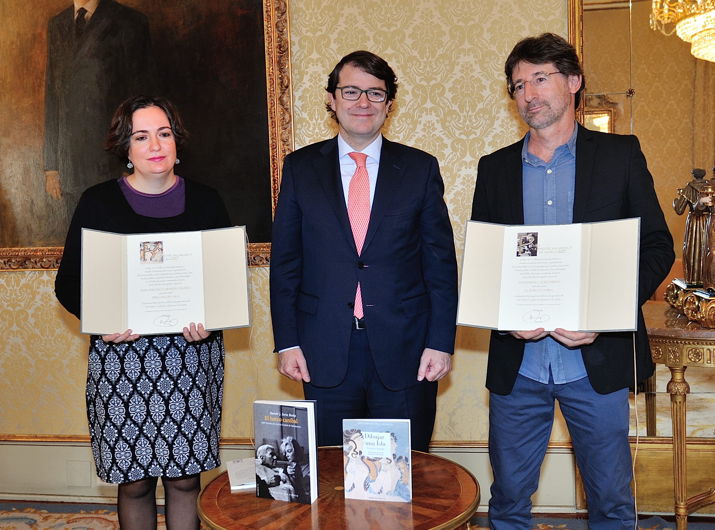 El alcalde de Salamanca, Alfonso Fernández Mañueco, ha entregado esta mañana el XXI Premio de Novela Ciudad de Salamanca a Ramón J. Soria Breña por la obra El barco caníbal y el XX Premio de Poesía Ciudad de Salamanca a Verónica Aranda por el poemario Dibujar una isla.