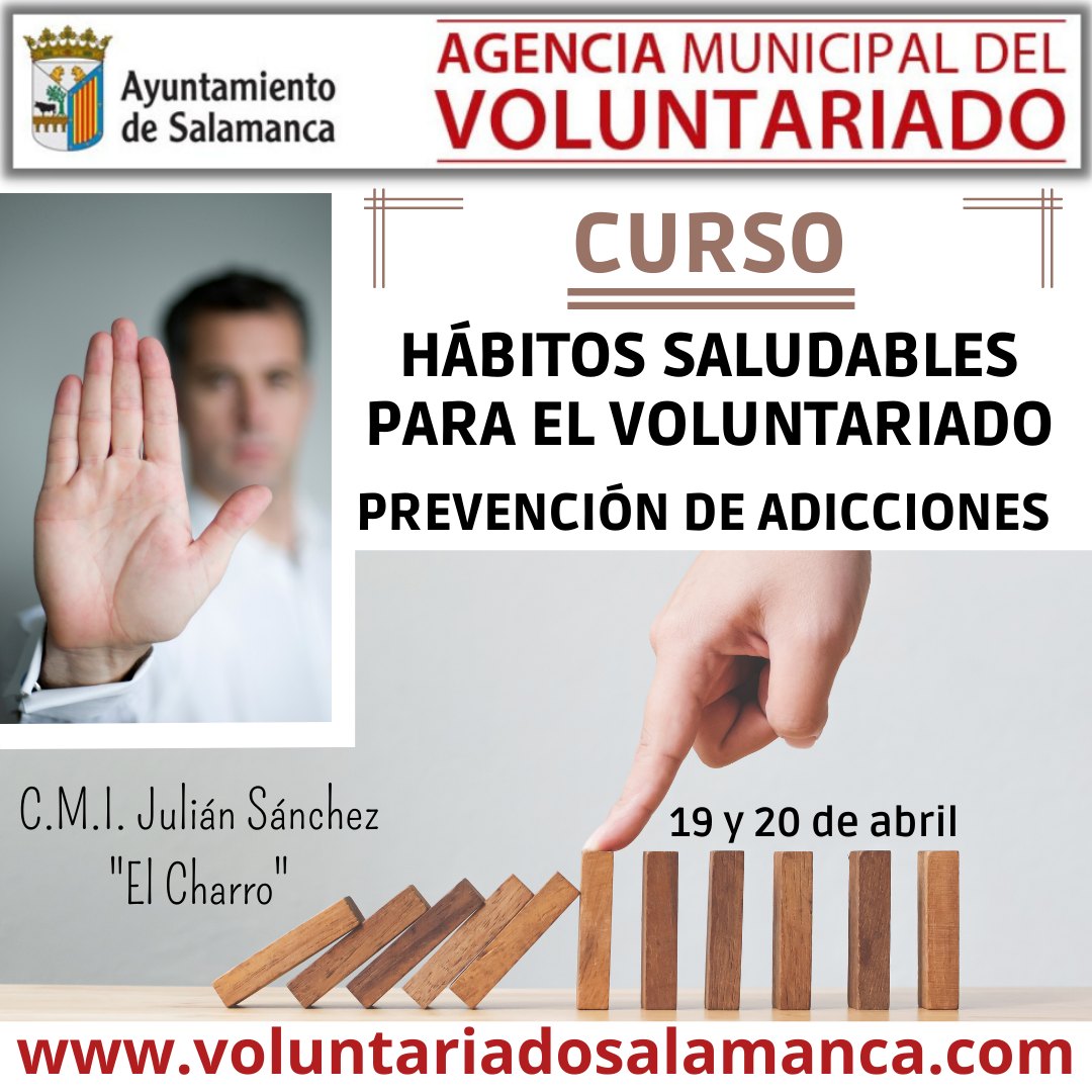 El Ayuntamiento de Salamanca ha organizado el curso de formación ‘Hábitos saludables para el voluntariado: prevención de adicciones’, incluido en la programación anual de la Agencia Municipal del Voluntariado, que tendrá lugar el 19 y 20 de abril en el Centro Municipal Integrado Julián Sánchez ‘El Charro’ de 17:00 a 18:30 horas.