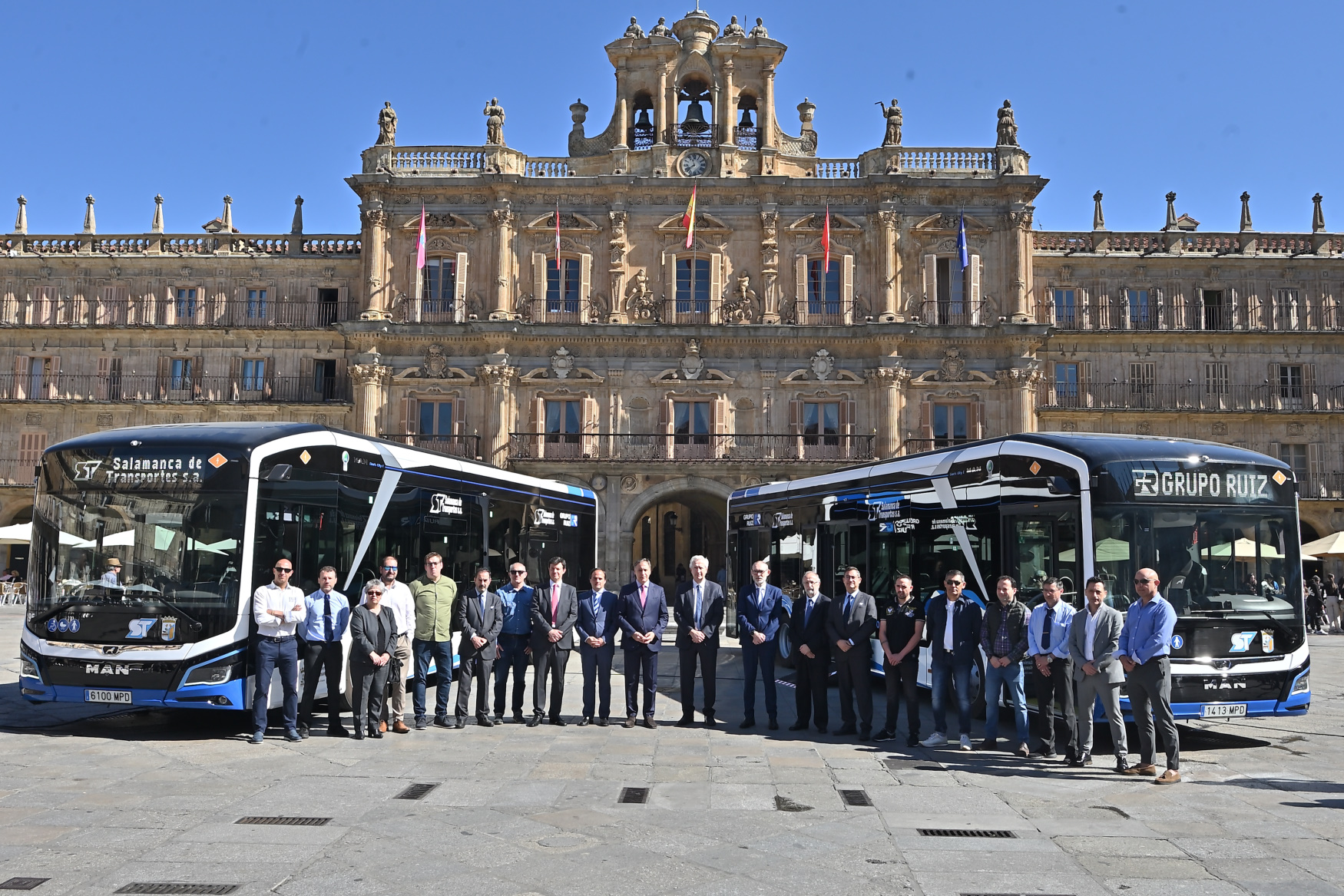 El alcalde de Salamanca, Carlos García Carbayo, y Gregorio Ruiz, presidente del Grupo Ruiz, al que pertenece Salamanca de Transportes, empresa gestora del servicio municipal de transporte urbano por autobús, han presentado en la Plaza Mayor los primeros vehículos eléctricos que se incorporan desde hoy a las líneas 2, 3, 4 y 9.