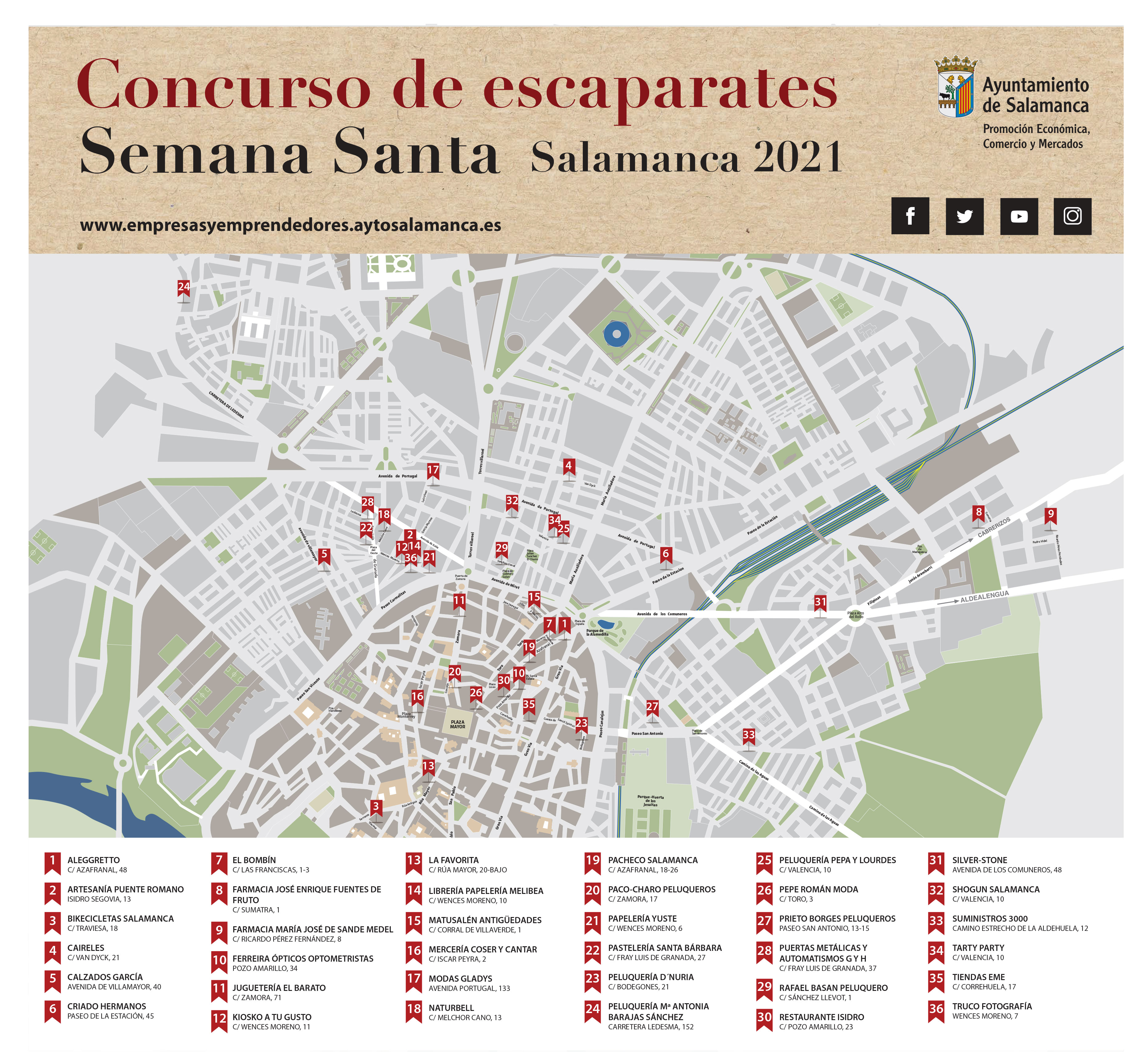 El Ayuntamiento de Salamanca continúa promocionando la Semana Santa de la ciudad con una serie de actividades que, al mismo tiempo, contribuyen a revitalizar el comercio local durante estos días. Salmantinos y turistas pueden recorrer hasta el 5 de abril los establecimientos participantes en el concurso de escaparates de Semana Santa, para lo cual se ha creado un mapa con la ubicación de cada uno de los 36 escaparates situados en diferentes zonas de la ciudad.