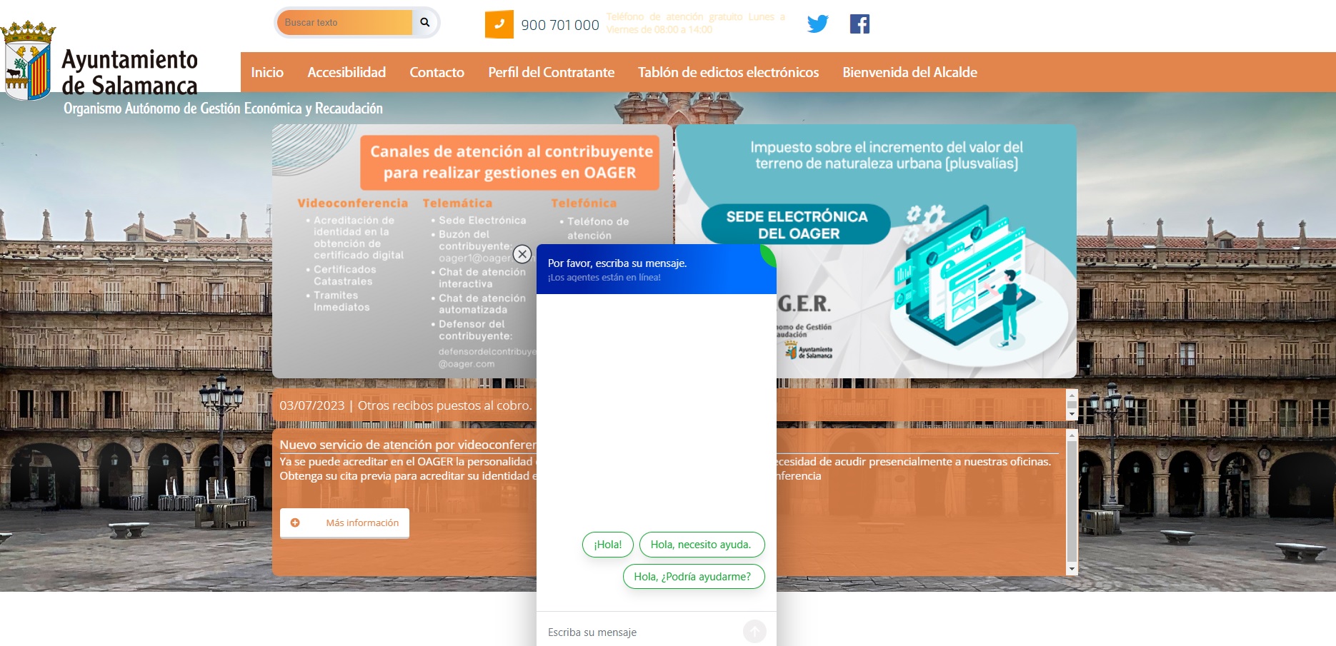El Ayuntamiento de Salamanca continúa mejorando la atención telemática que presta el Organismo Autónomo de Gestión Económica y Recaudación (OAGER) para facilitar la gestión tributaria de los contribuyentes, sobre todo a raíz de la situación provocada por la pandemia del COVID-19. Desde la puesta en marcha a finales de 2020 de un ‘chatbot’ en tiempo real, se han resuelto más de 33.000 dudas a los ciudadanos.